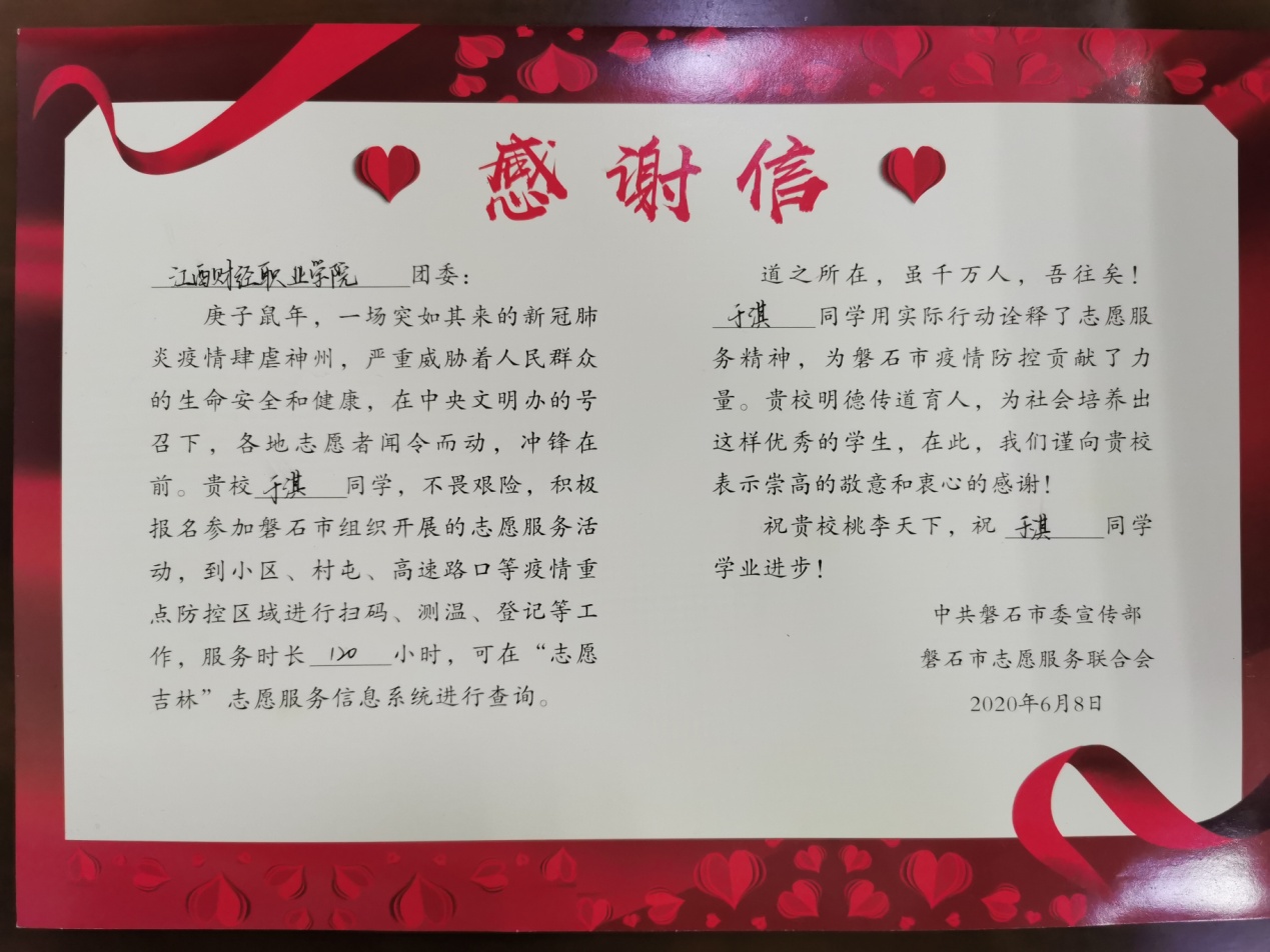 “庚子鼠年,一场突如其来的新冠肺炎疫情肆虐神州,严重威胁着人民群众的生命安全与健康,在中央文明办的号召下,各地志愿者闻令而动,冲锋在前。贵校于淇同学,不畏艰险,积极报名参加磐石市组织开展的志愿服务活动,到小区、村屯、高速路口等疫情中重点防控区域进行扫码、测温、等级等工作,服务时长120小时,可在“志愿吉林”志愿服务消息系统金萱查询。”感谢信如是写道。
