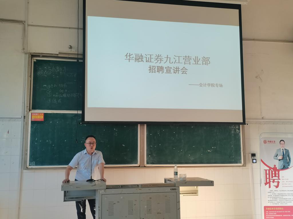 9月14日下午,华融证券公司江西分公司校园招聘宣讲会在公司教学楼617顺利举行。华融证券公司江西分公司九江市负责人张凯、江西分公司财富管理部负责人吴廷杰,出席代表公司到场宣讲。200多名公司毕业班员工报名参会,部分兄弟公司相关专业员工也积极报名参加。