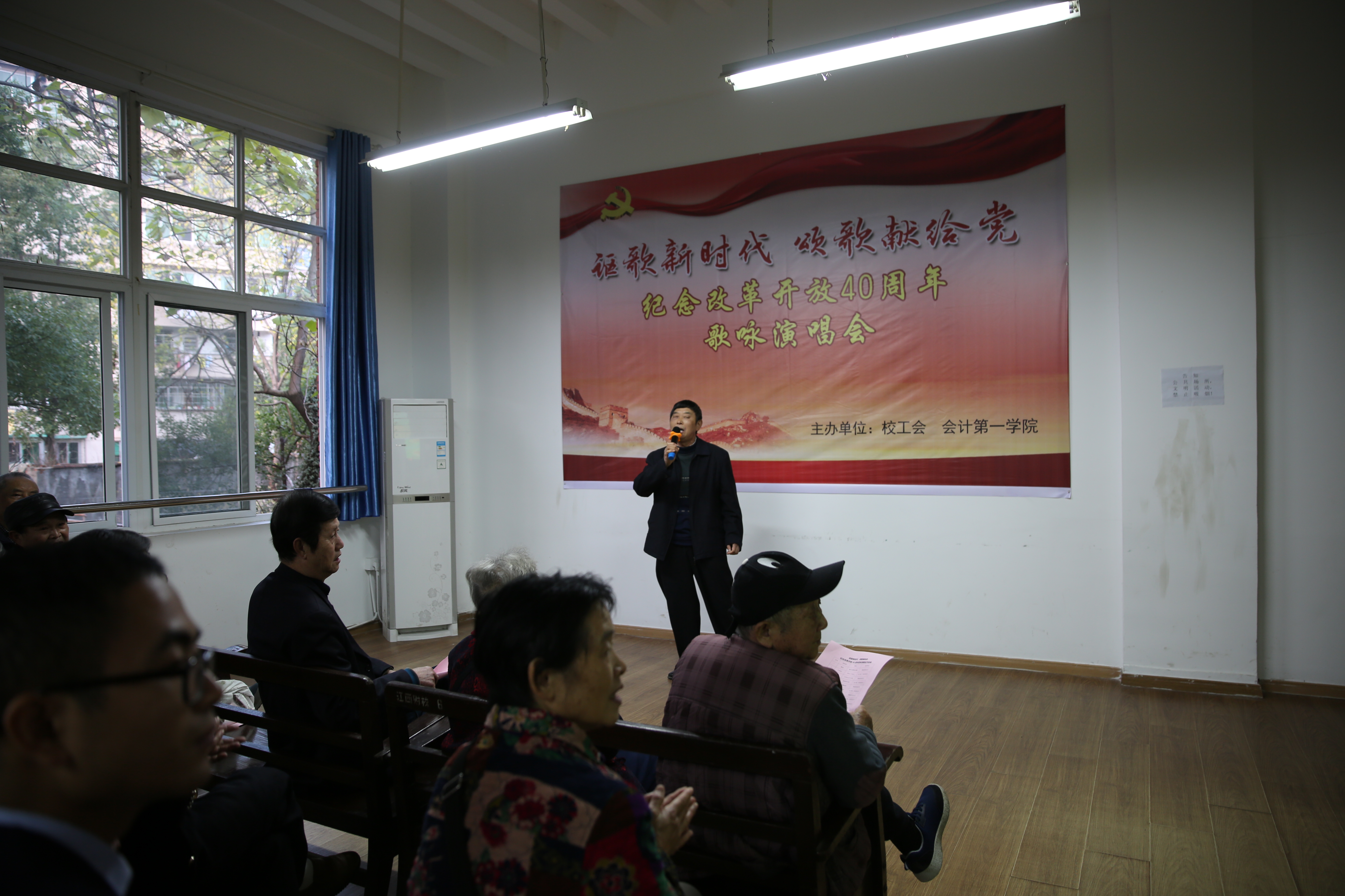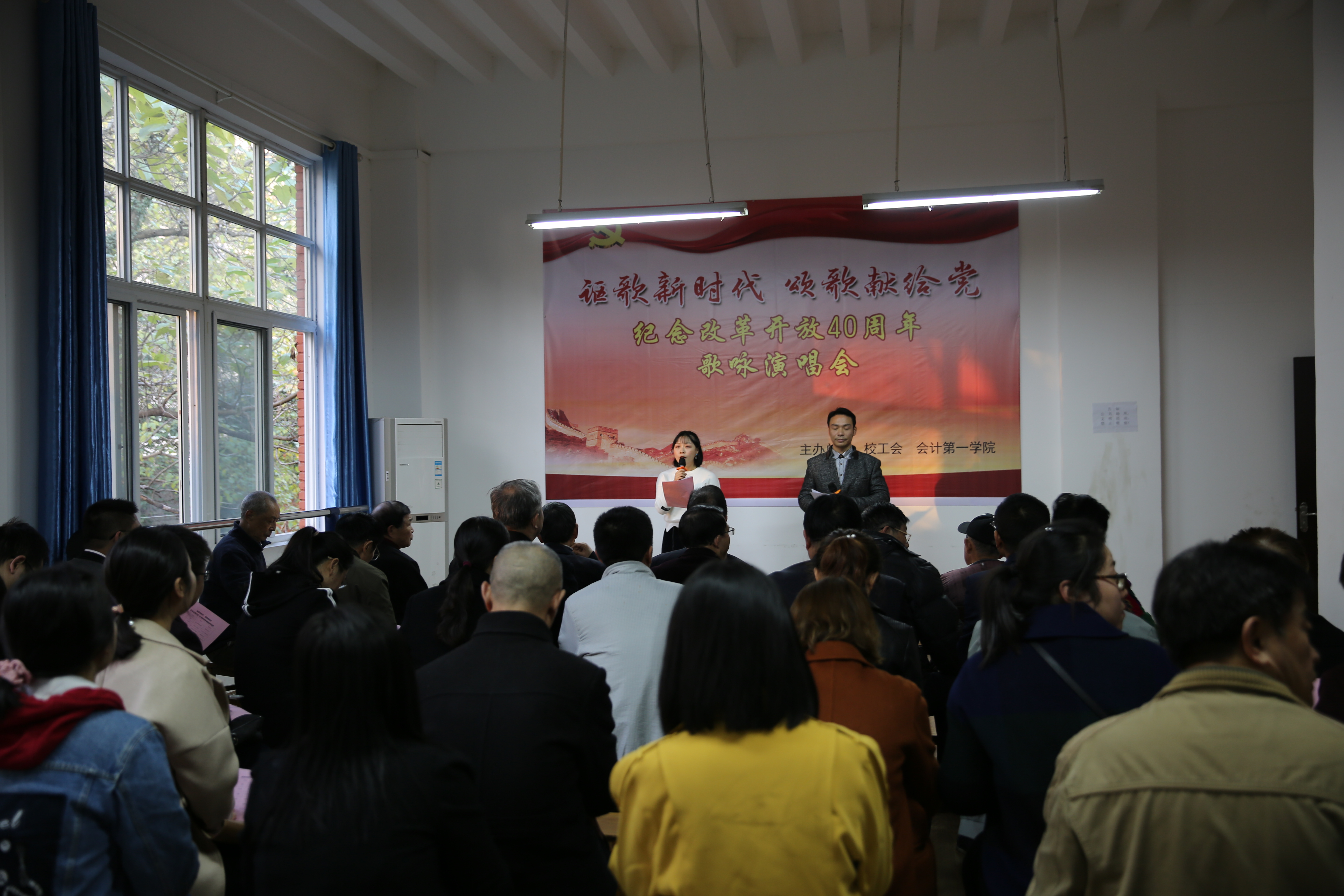 在我们伟大祖国迎来改革开放四十周年之际,为回顾我国改革开放取得的伟大成就,歌颂我们党领导中国人民进行改革开放和现代化建设取得的光辉业绩,11月27日下午4:30,校工会与公司在本校东校区红楼工会职工俱乐部联合举办了以“讴歌新时代颂歌献给党”为主题的纪念改革开放40周年歌咏演唱会。校工会、公司的教职工代表及公司离退休老同志代表共六十余人参加了此次活动,由卢路和吕相宜两位青年教师担任本次演唱会的主持人,离退休党总支和公司党总支共同选送了十一个节目登台演出,参加演唱的丁良珠、陈卫东、廖剑、黄益军、杨郁、卢洪信、张家顺、杨燕、卢路、吕相宜、徐佳佳等十一位党员教师用动人的歌声、饱满的激情、优美的旋律、优秀的歌曲、良好的形象,放歌新时代,唱响主旋律,向祖国改革开放四十周年献上最美好的祝愿。
