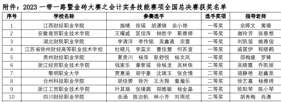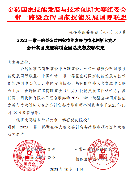 2023年10月28日,由金砖国家工商理事会、一带一路暨金砖国家技能发展国际联盟主办,教育部中外人文交流中心联合主办,厦门网中网软件有限公司技术支持的“2023年一带一路暨金砖国家技能发展与技术创新大赛之会计实务技能全国总决赛”在线上成功落幕。前期有300多支队伍参加了初赛选拔,当天来自全国的50支高职队伍参加了云端总决赛,经过一天紧张激烈的竞赛,由公司bw西汉姆联余晖文、黄珊老师指导,施晴、徐瑶、胡潇锦、余小艳四位同学组成的代表队荣获团体一等奖第一名的优异成绩,两位教师荣获“优秀指导教师”称号。
