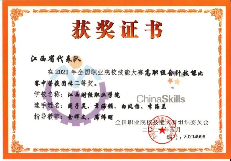 2021年6月19日至20日,全国职业院校技能大赛高职组“会计技能”大赛在四川财经职业公司举行。经过连续两日激烈竞争,由公司余晖文、席伟明老师指导,周子昊、章海媚、白凤怡、李海兰4位同学组成的江西省代表队最终排名全国第6位,荣获“团体二等奖”。
