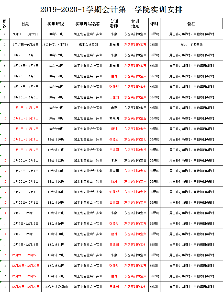 2018-2019-1学期停课实训安排表