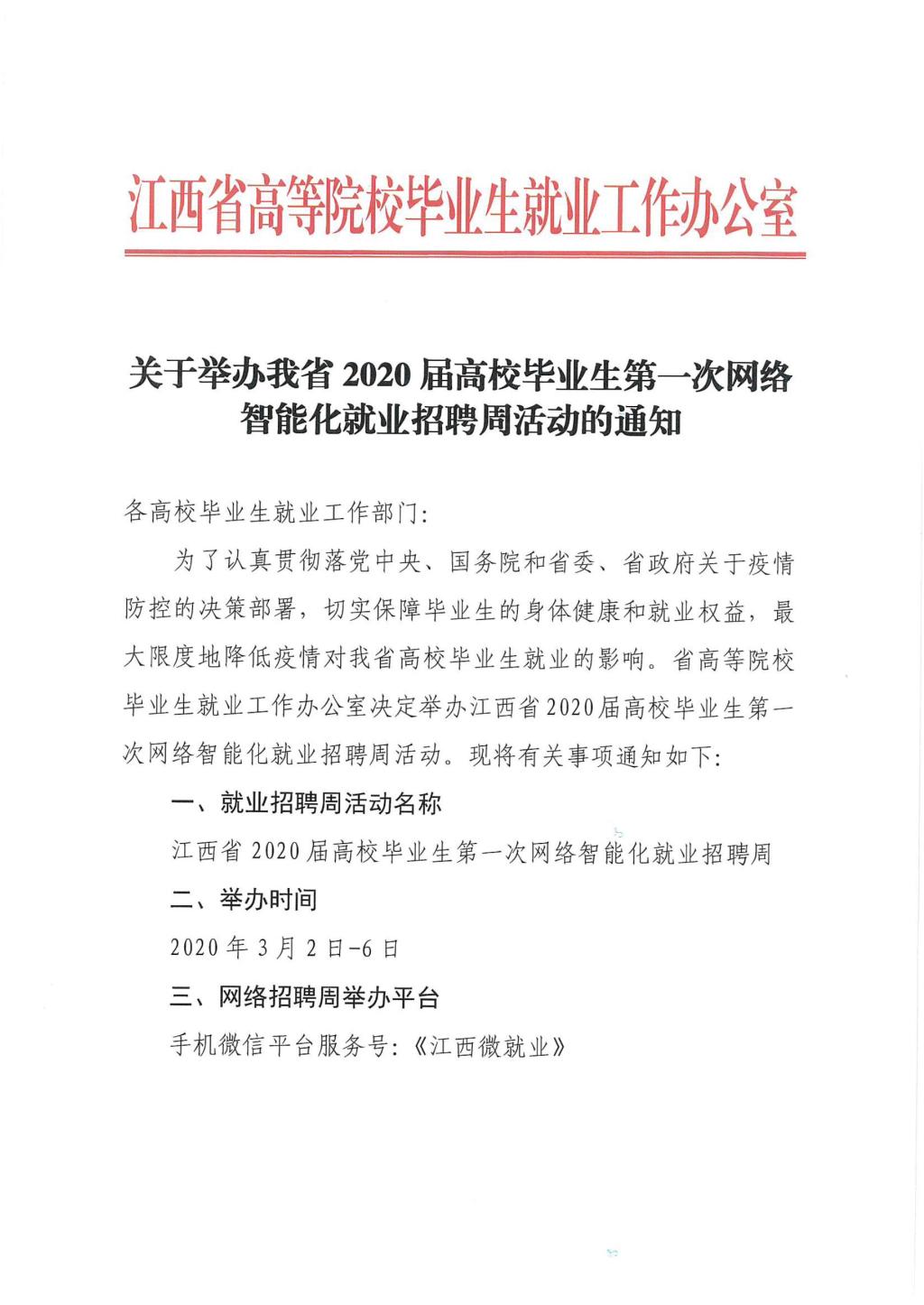 关于举办百千万线上线下招聘专项行动暨省内2020届高校毕业生网络智能化就业招聘周活动的通知赣人社字[2020]162号(1)