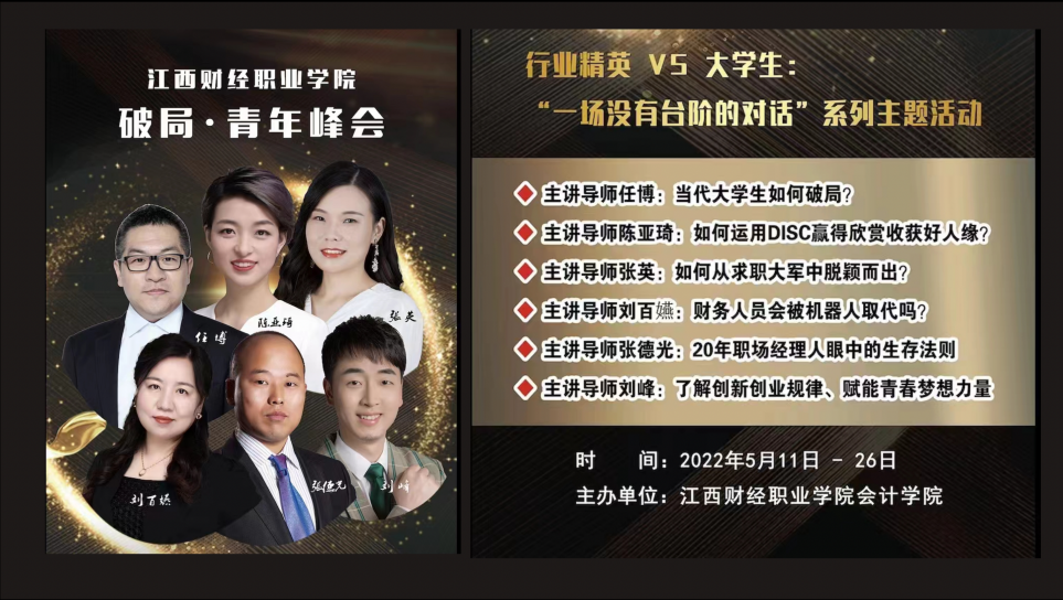 “破局·青年峰会:一场没有台阶的对话”系列主题活动时间从2022年5月11日至5月26日,一共分为六日程。这是企业精英人士与公司青年学子之间的直接对话,聚焦于“企事业单位用人需求”和“老员工成长方向”的深度融合,围绕六大主题方向,把高校人才培育、精英视角下的用人单位需求、员工成长融为一体。一方面为员工搭建与企业之间的对话平台,近距离接触企业用人深层需求。另一方面帮助公司积极探索“产教融合、校企合作”的深化改革形式。