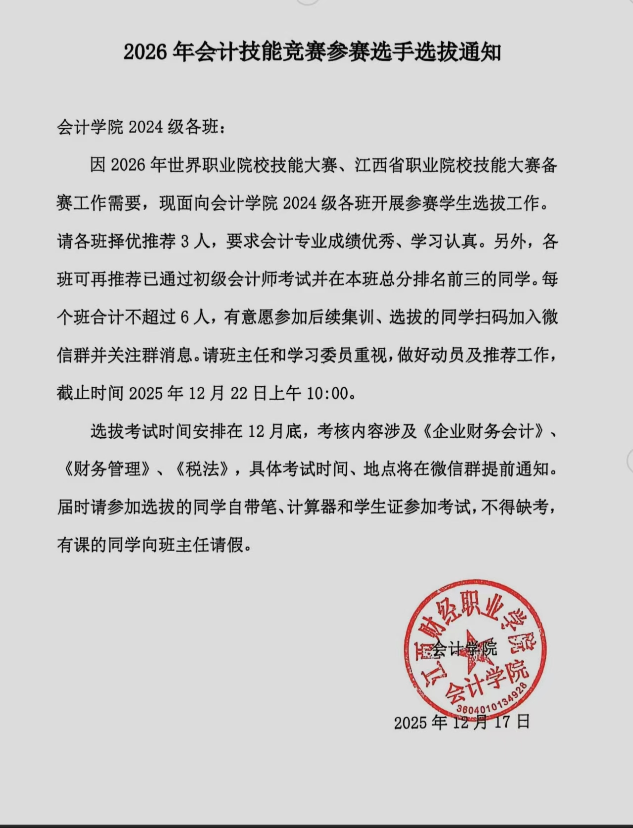 2026年会计技能竞赛参赛选手选拔